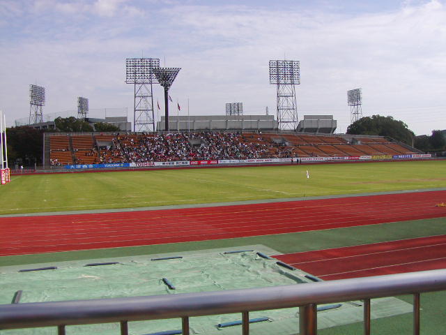 陸上トラック付きのスタンドはグランドまでの距離が遠いんですが、特にここ西京極陸上競技場は、メインスタンドと400mトラックの間に、幅跳び用のレーンまであるので、さらに遠いんですよねえ。なので、入場が早かったこともあり、最前列に座りました。