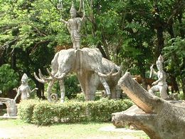 で、ブッダパーク。お寺ではないと事前に聞いてはいたが、仏教・ヒンドゥー教なんかが混合した、石像ではなくコンクリート像が林立する、まさに公園だった。でも味があって、なんか面白い。あまり客もいないので、のんびりと散策を楽しむ。中に入れるほど大きいナンキンのような像……宇宙を表してるのかな?(内部には数多の像で現世・天国・地獄等が表現されている)や寝大仏、等々。普通の仏像もあるけど、ふつう像にしないようなシーンを切り取ったものも多い。以下に写真の一部を並べてみます。重くてごめんなさい。