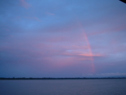まだ日は高いが疲れたので、部屋でまどろむ。夕方にスコールの音で目がさめた。テラスでぼんやりと雨に打たれる川面を眺めていると、やがて雨雲が抜け、メコンに虹がかかった。