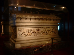 そうやって見ていくうちに、ガイドブックにも必見と書かれているアレキサンダー大王の石棺の前にやってきた。正直あまり期待しないで来たのだが、その期待は見事に覆された。紀元前に作られたものとしては信じられないくらい保存状態がよく、そこに施されている彫刻も見事なものだ。左端に彫られているのがアレキサンダー大王の姿らしいが、威風堂々としたものだった。これを見れただけでも来てよかった。