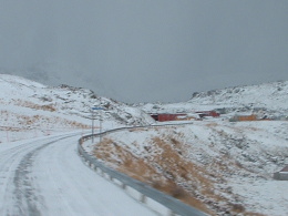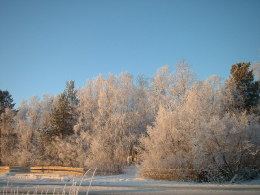結構川幅のあるカラショク川が氷結し、その上に薄く雪が被さり、見事な景色が現出している。よく見ると、川の氷の上に車が乗り上げて走り回った跡がある。スノーモービルが走り回った跡も。どれだけ厚く張ってるんだ。空が淡い青で、白い川とのコントラストが美しい。
