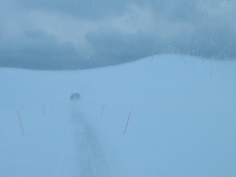 見渡す限り360度、雪の原野が地平線の彼方まで広がっている。凄いよなあ。雪景色だから分からないけど、夏場は何の土地なんだろう。人の住んでる気配もないし、畑とも牧草地とも思えないし、やっぱり荒野、原野なのかなあ。